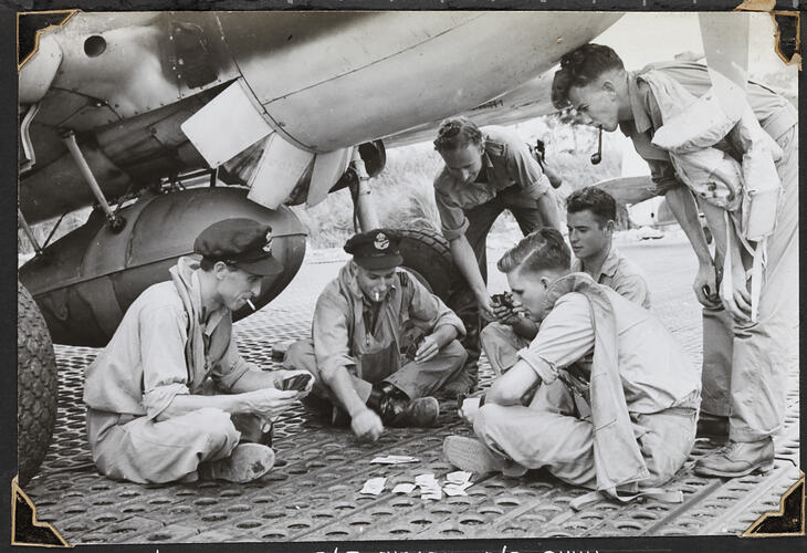 A group of 77 Squadron RAAF pilots playing cards under a P-40 Kittyhawk fighter aircraft in New Guinea.