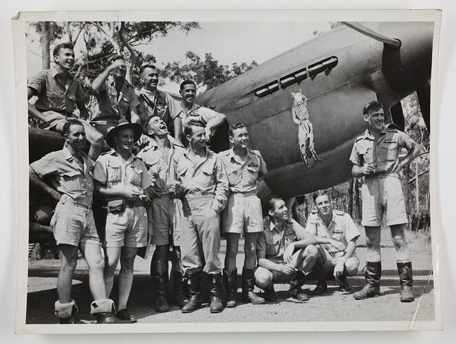 A group of airmen posed around an aircraft, the nose art is prominent in the background, around the time of World War II