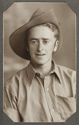 Head and shoulder portrait of Private W.R. Attwood of the Australian Imperial Force (AIF) during World War II.
