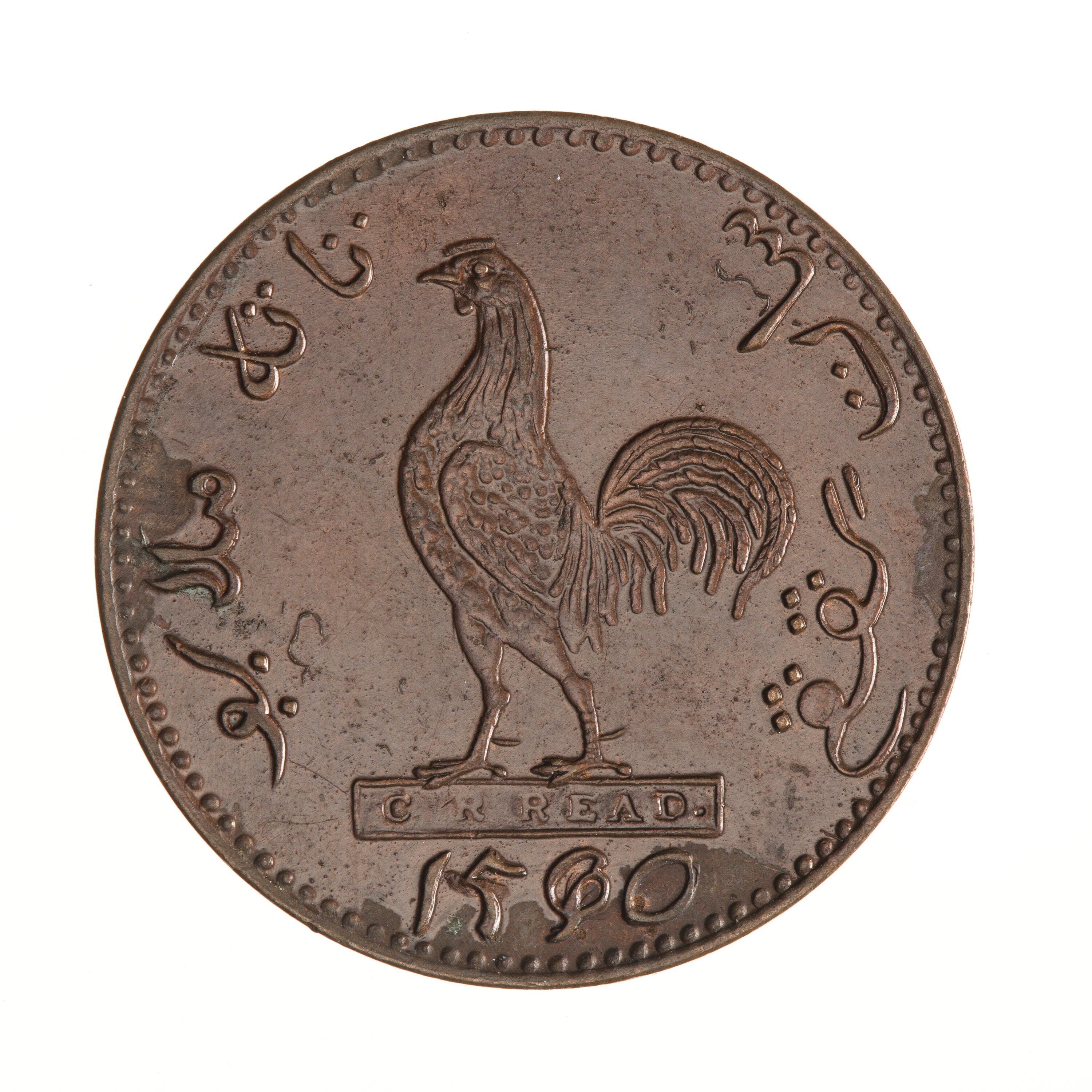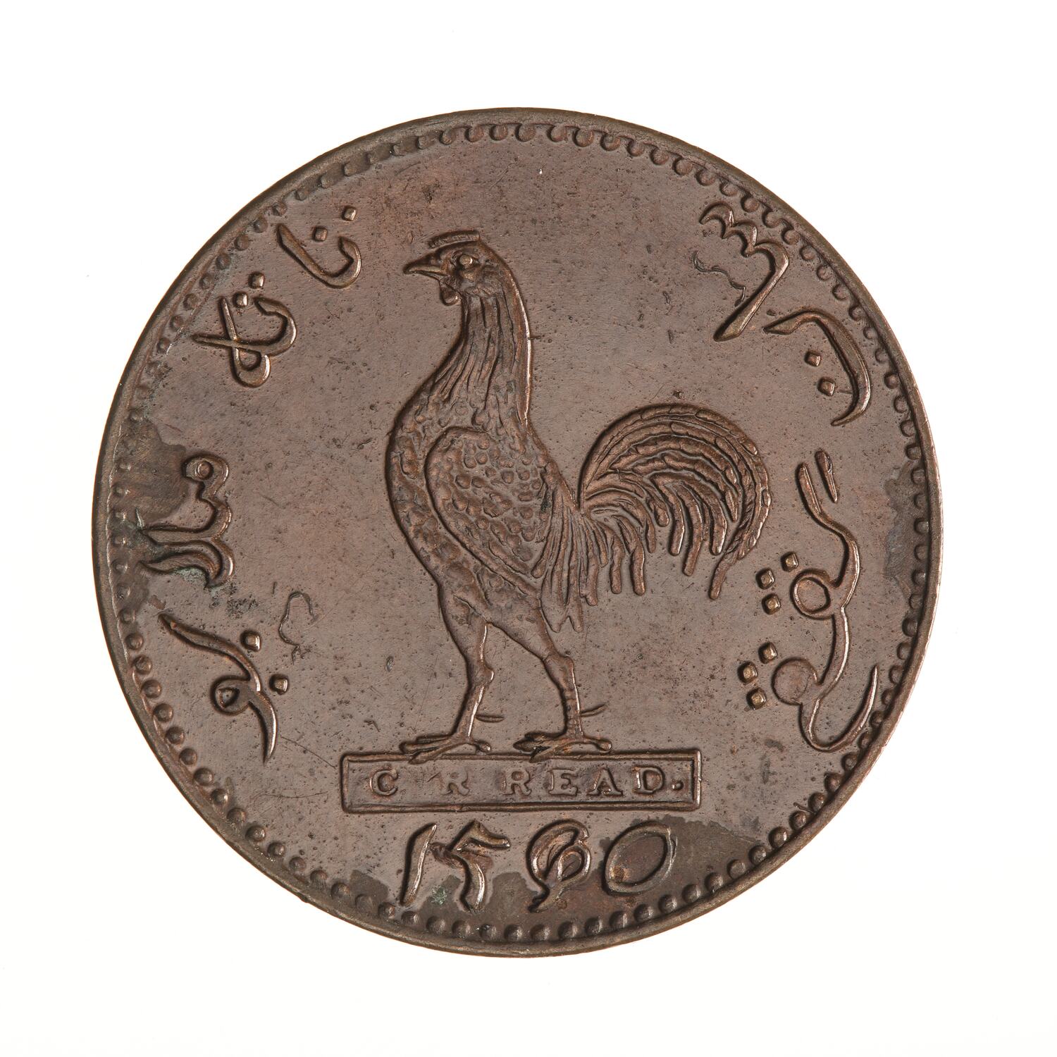 Rooster standing facing left on box with incuse legend, C R READ