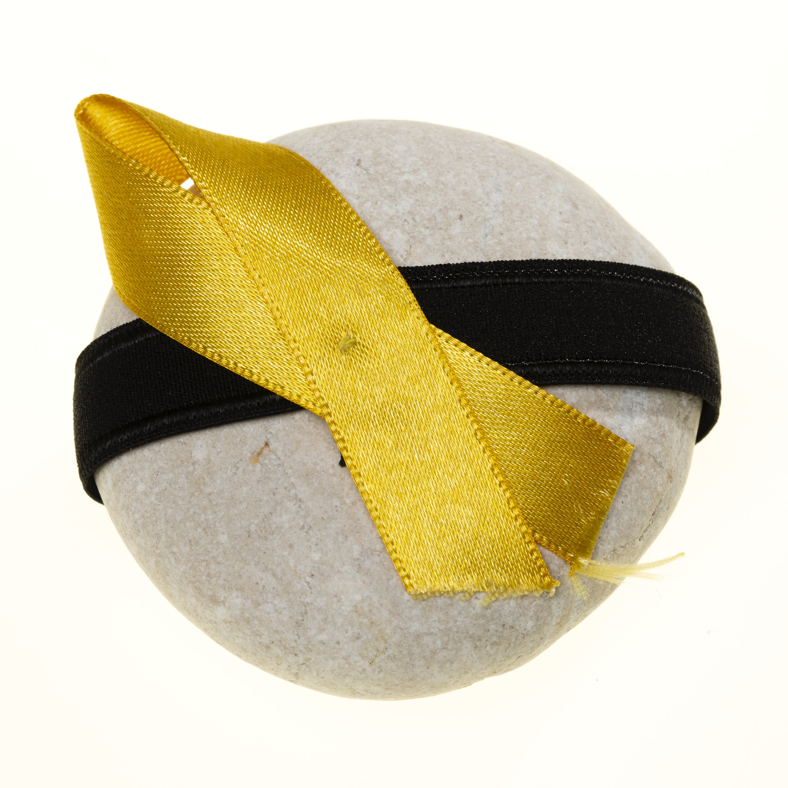 Small river stone with a black elastic band onto which is sewn a yellow ribbon.