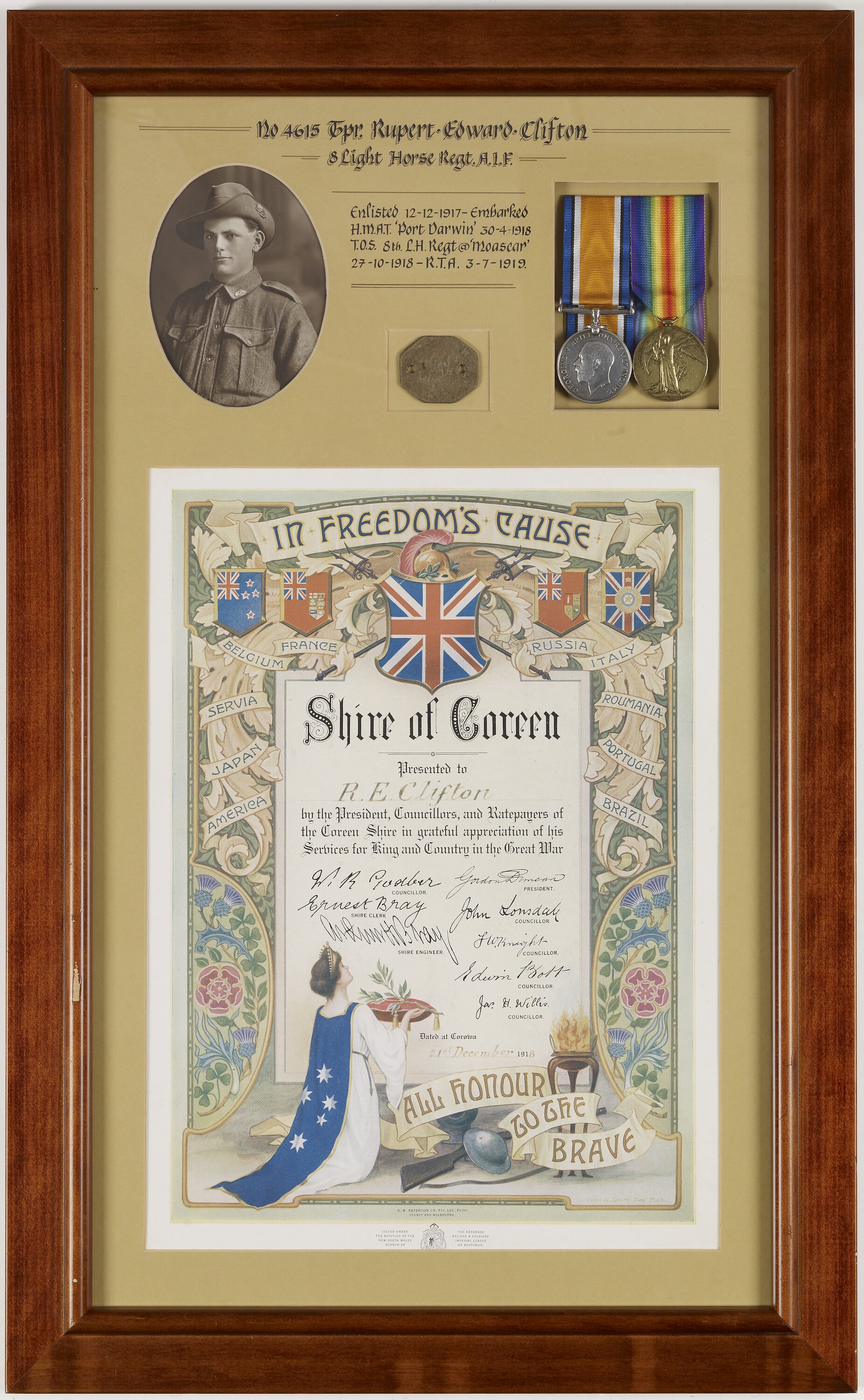 Hand-written in black ink on the centre top of the mount: 'No. 4615 Tpr. Rupert Edward Clifton / 8 Light Horse Regt. A.I.F.' Hand-written in black ink on the mount between a photograph and two medals: 'Enlisted 12-12-1917 - Embarked / H.M.A.T. 'Port Darwin' 30-4-1918 / T.O.S. 8th L.H. Regt @ 'Moascar' / 27-10-1918 - R.T.A. 3-7-1919' Printed on an image of an unfurled banner across the top of the certificate: ''In Freedom's Cause' Printed on the left hand side of the main text of the certificate: 'France / Belgium / Servia / Japan / America' Printed as part of the main text of the certificate: 'Shire of Coreen / Presented to' Hand-written in black ink on the certificate below the above text: 'R.E. Clifton' Printed as part of the main text of the certificate, below above text: 'by the President, Councillors, and Ratepayers of / the Coreen Shire in grateful appreciation of his / Services for King and Country in the Great War / (signature); (signature) / Councillor; President / (signature); (signature) / Shire Clerk; Councillor / (signature); (signature) / Shire Engineer; Councillor / (signature) / Councillor / (signature) / Councillor / Dated at Corowa' Hand-written in black ink on the certificate below the above text: '21st December / (printed) 1918' Printed on the right hand side of the main text of the certificate: 'Russia / Italy / Roumania / Portugal / Brazil' Printed on an image of an unfurled banner across the bottom of the ceritificate: 'ALL HONOUR / TO THE / BRAVE' Disclaimer printed on the bottom of the certificate: 'DW PATERSON CO. PTY. LTD. PRINT / SYDNEY AND MELBOURNE' Disclaimer printed on the bottom of the certificate below the border: 'ISSUED UNDER THE / AUSPICES OF THE / NEW SOUTH WALES / BRANCH OF; THE RETURNED / SAILORS & SOLDIERS / IMPERIAL LEAGUE / OF AUSTRALIA'