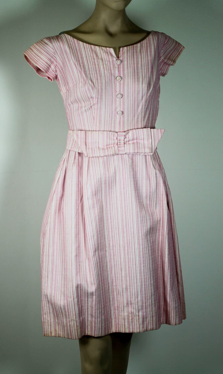 Pink striped dress with scooped neckline and belt. Knee-length.Hooks, cloth eyes and metal press studs fasten belt, which is finished with a bow. Metal side zip.