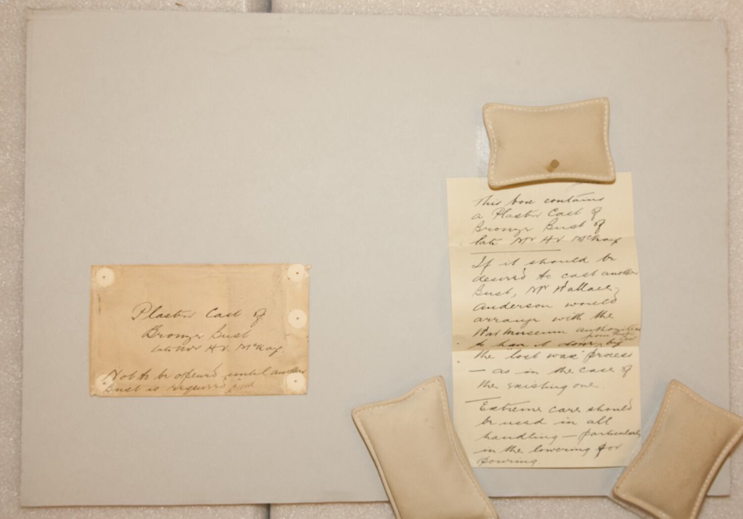 Handwritten: 'Jan 1928[?]/This box contains/a Plaster Cast of/Bronze bust of/late Mr H.V. McKay/If it should be/desired to cast another/Bust, Mr Wallace-/Anderson would/arrange with the/War Museum authorities/to have it done from Plaster Cast by/the "lost wax" process/- as in the case of/the existing one./Extreme care should/be used in all/handling - particularly/in the lowering for/pouring.'