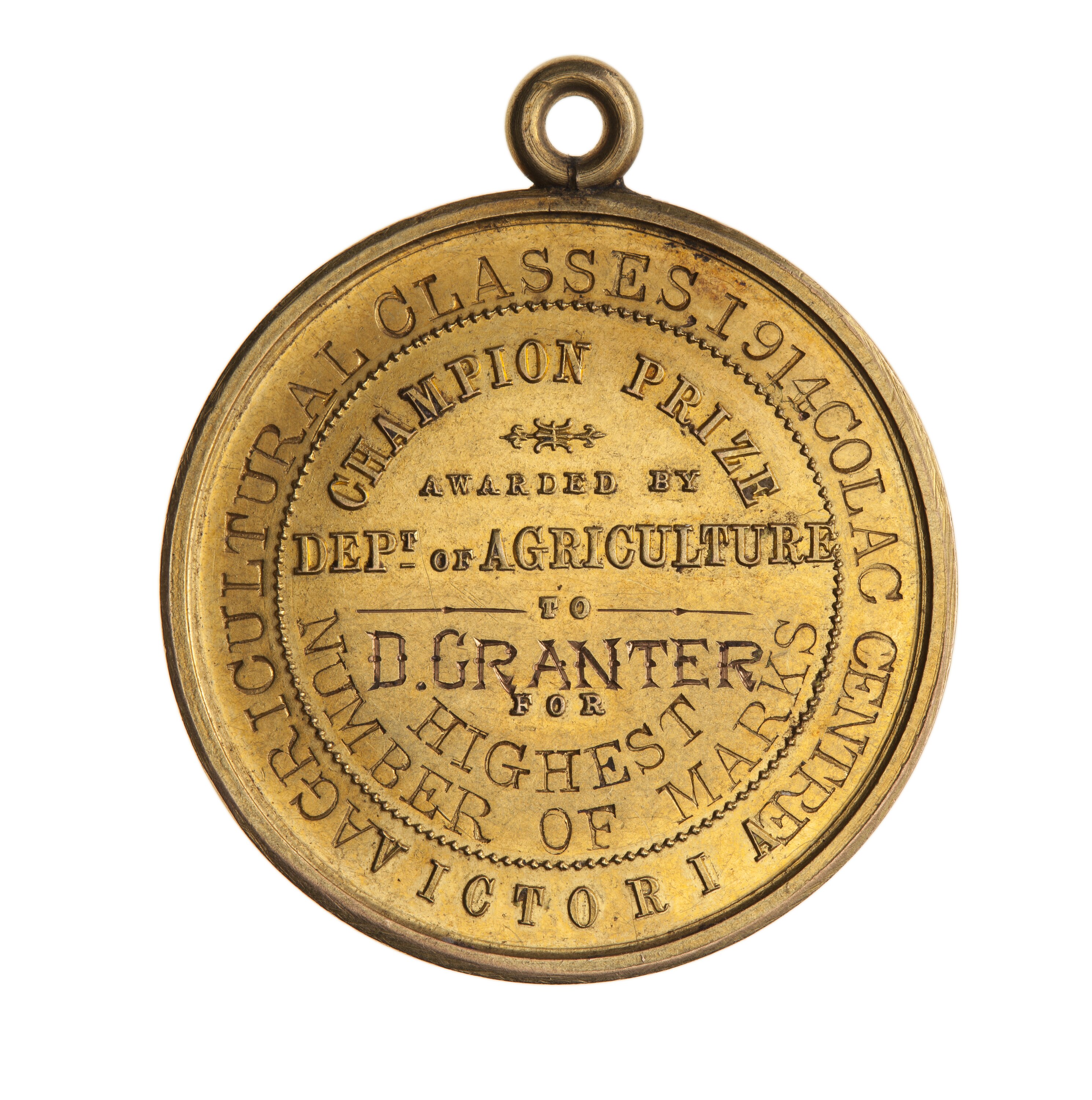 Department of Agriculture Victoria, Colac Centre, 1914, in gold (15ct, 31mm) Champion Prize to D. Granter, for highest number of marks, agricultural classes