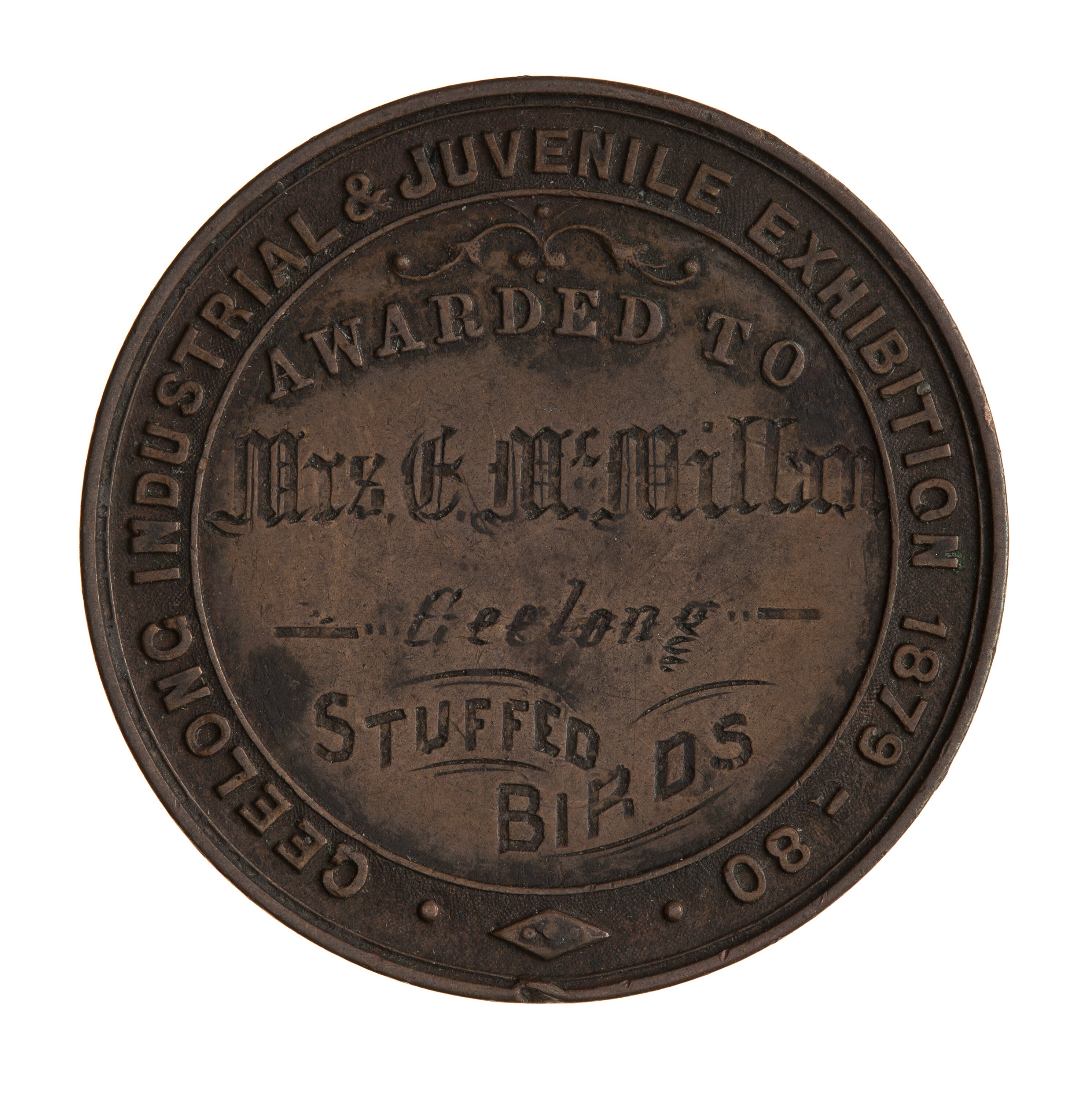 In centre , AWARDED TO /Mrs C.McMillan/ Geelong / STUFFED / BIRDS. Around, GEELONG INDUSTRIAL & JUVENILE EXHIBITION 1879-80
