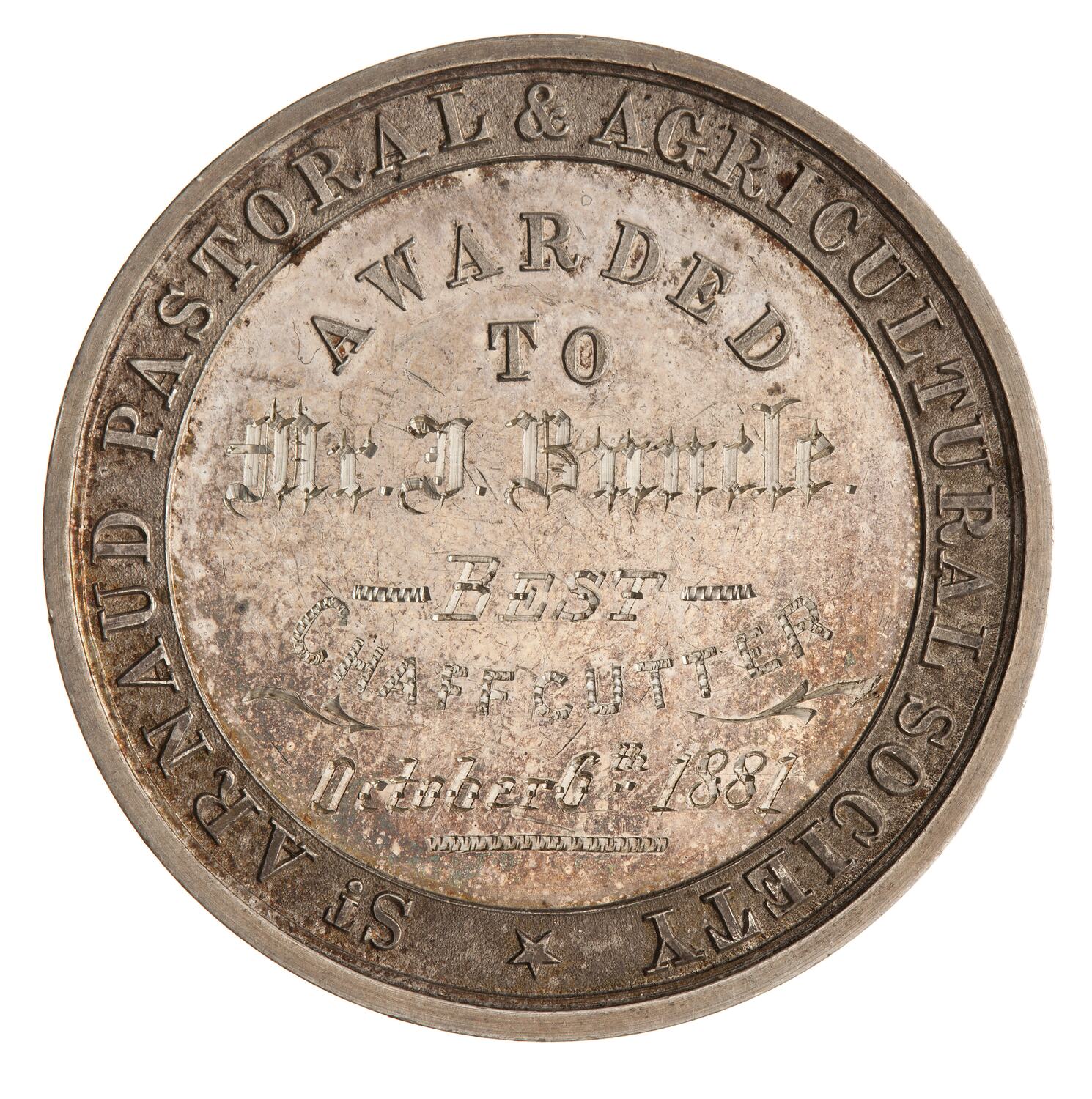 In centre, AWARDED / TO / Mr J.Buncle/ BEST / CHAFF CUTTER /October 6th 1881. Around, ST ARNAUD PASTORAL & AGRICULTURAL SOCIETY