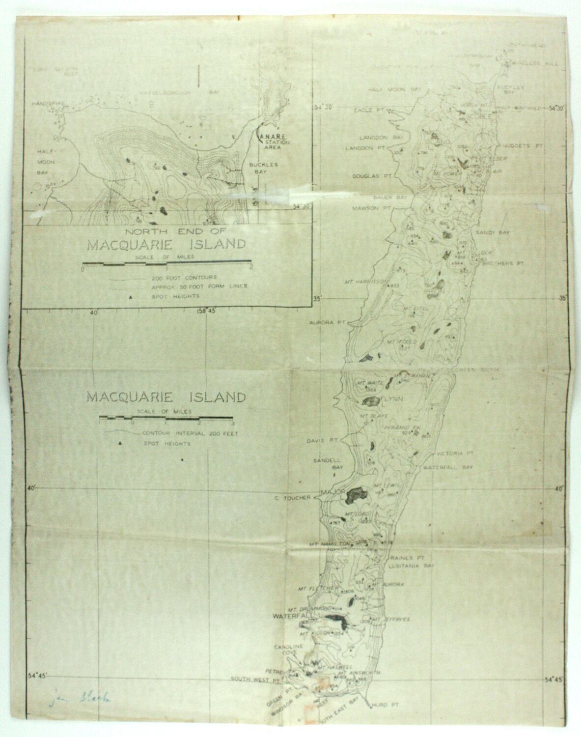 Map of Macquarie Island used by Hope Macpherson after 1948, showing place names, elevations, navigation co-ordinates, using imperial measurements.