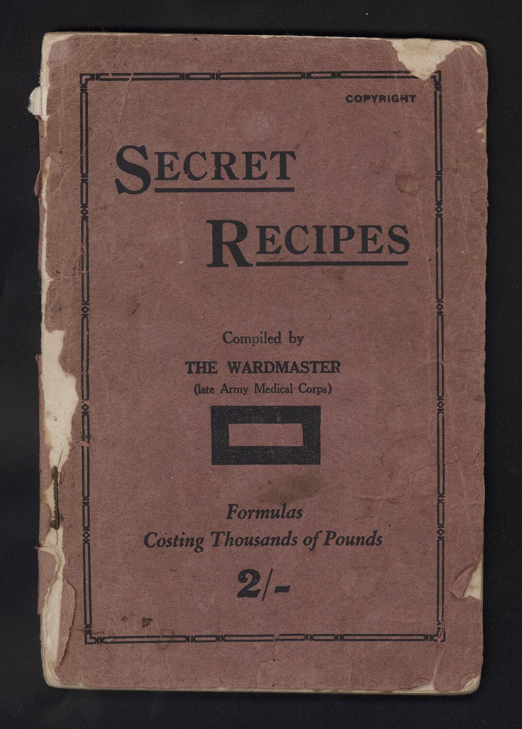 Cover: 'SECRET / RECIPES / Compiled by / THE WARDMASTER / (late Army Medical Corps) / Formulas / Costing Thousands of Pounds / 2/- / COPYRIGHT'. Extensive text within book.