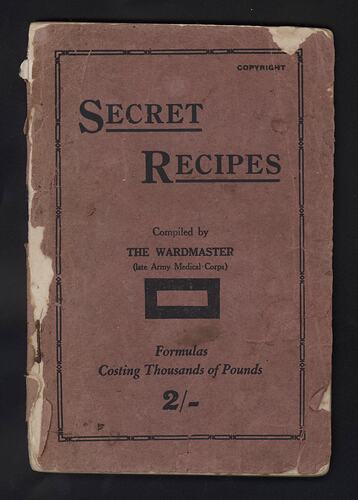 Book entitled 'Secret Recipes: Including Toilet Formulas, Private Trade Recipes, Advertised "Patent Medicine" Analysis, Secret Medical Recipes, Exclusive Cookery Recipes', published around 1923. Compiled by 'The Wardmaster', who is identified by the State Library of Victoria as Thomas J. Holmes. Holmes served in the Royal Army Medical Corps during World War I and apparently migrated to Australia after the war. He became secretary (and possibly founded) the Disabled Servicemen's Association of Australia.