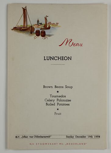 Lunch menu used by German migrant Guenter Schneider during his voyage to Australia on the Nederland Line ship MV Johan van Oldenbarnevelt on 19 December 1954.
