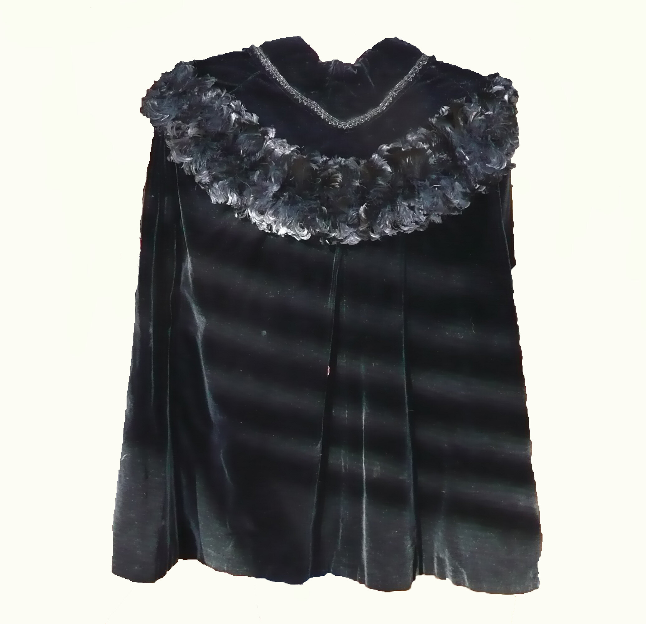 Short black velvet cape with trim of short, curled feathers around shoulders (the donor suggests Black Orpington feathers). High collar with squared corners and beaded trim. Slots for hands at front. Quilted lining. Fastens with hooks and eyes. Machine-sewn. Tape for hanging at neck has broken.