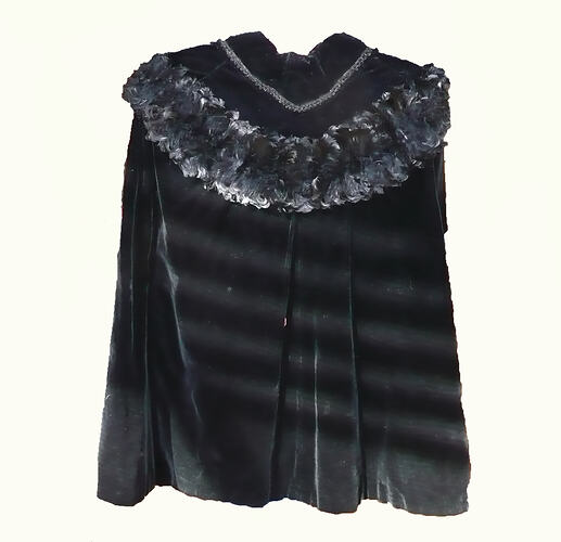 Short black velvet cape with feather trim. Believed to have been used by Annie Blakeley in Melbourne in the 1880s, and associated with the reticule also donated by the family (HT30271). Although likely to have been made in Melbourne, the cape has no label.