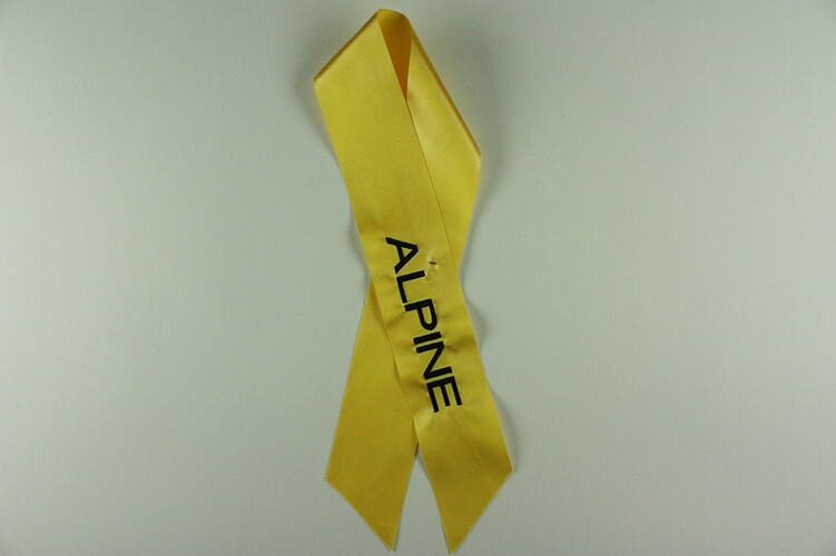 One of 34 pre-printed yellow ribbons placed on 'The Tree of Remembrance' at the 2nd Anniversary Memorial Service to commemorate the 2009 Victorian bushfires. Placed on the Tree of Remembrance by Quentin Bryce, Governor General.