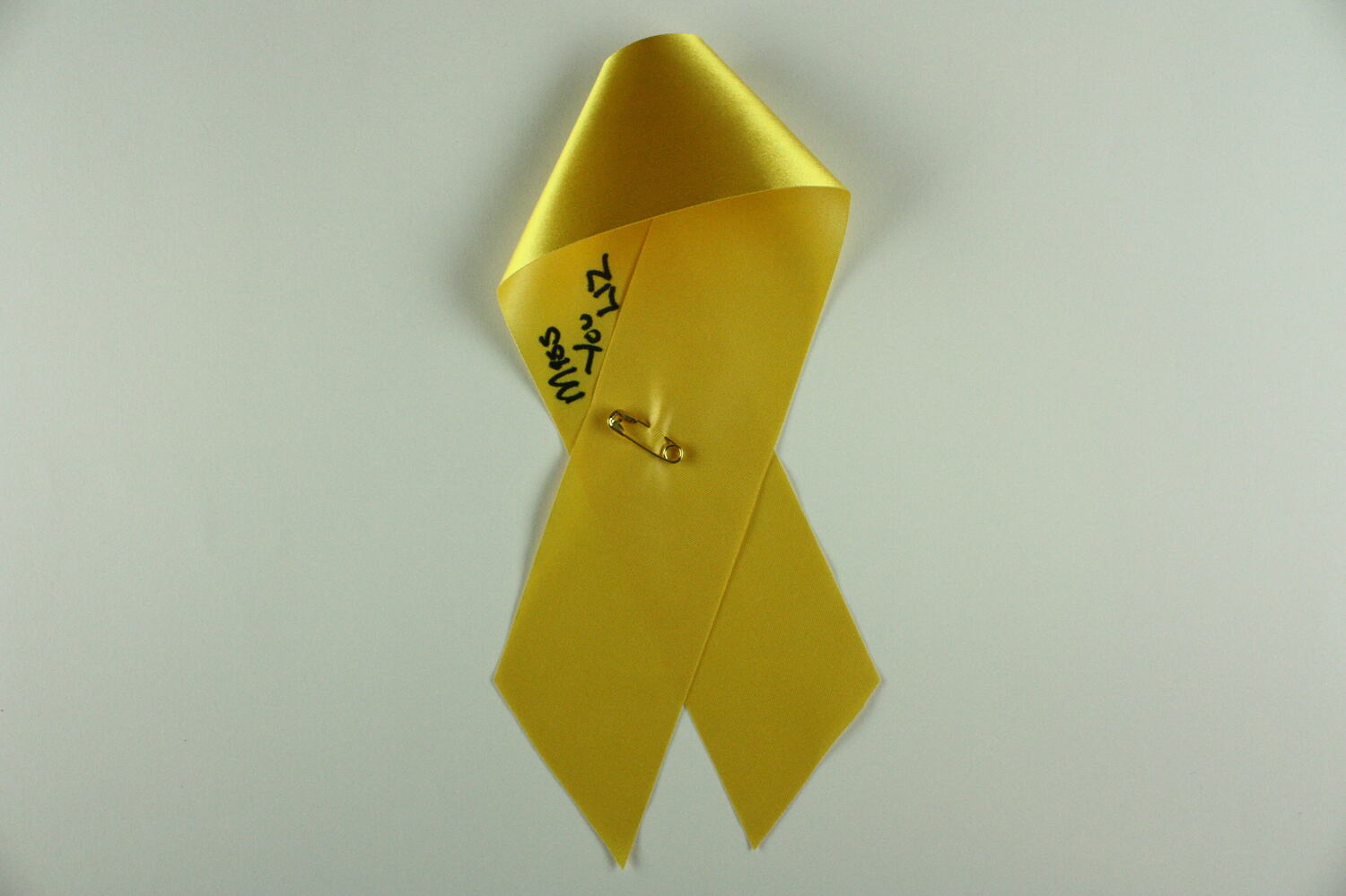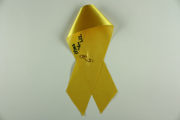 One of nine hand written yellow ribbons placed on 'The Tree of Remembrance' during its display at the Rebuilding Advisory Centres at Marysville and Kinglake, during February and March 2011. Blank yellow ribbons were available for visitors to Marysville and Kinglake to write and attach messages to the tree.