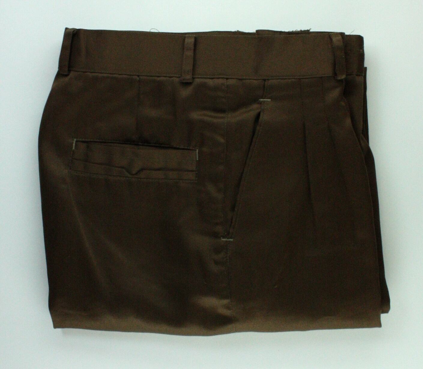 Brown polyester boy's trousers with front central leg pleats, waistband with belt hoops and zip and hook and eye waist fastener. Trouser legs stitched but no hems or cuffs. Inside label at waist has 'Starway' brand and materials and washing instructions. Front and back pockets.