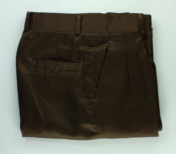 Pair of trousers worn by Bul Ayuel Bulkoch when he arrived in Melbourne as a Sudanese refugee in October 1996. Along with the shirt he was also wearing, it was all he owned, having distributed his other belonging amongst relatives and having to rush to catch the plane before it departed with his family from Nairobi.The trouser hems have been let down to lengthen the legs.