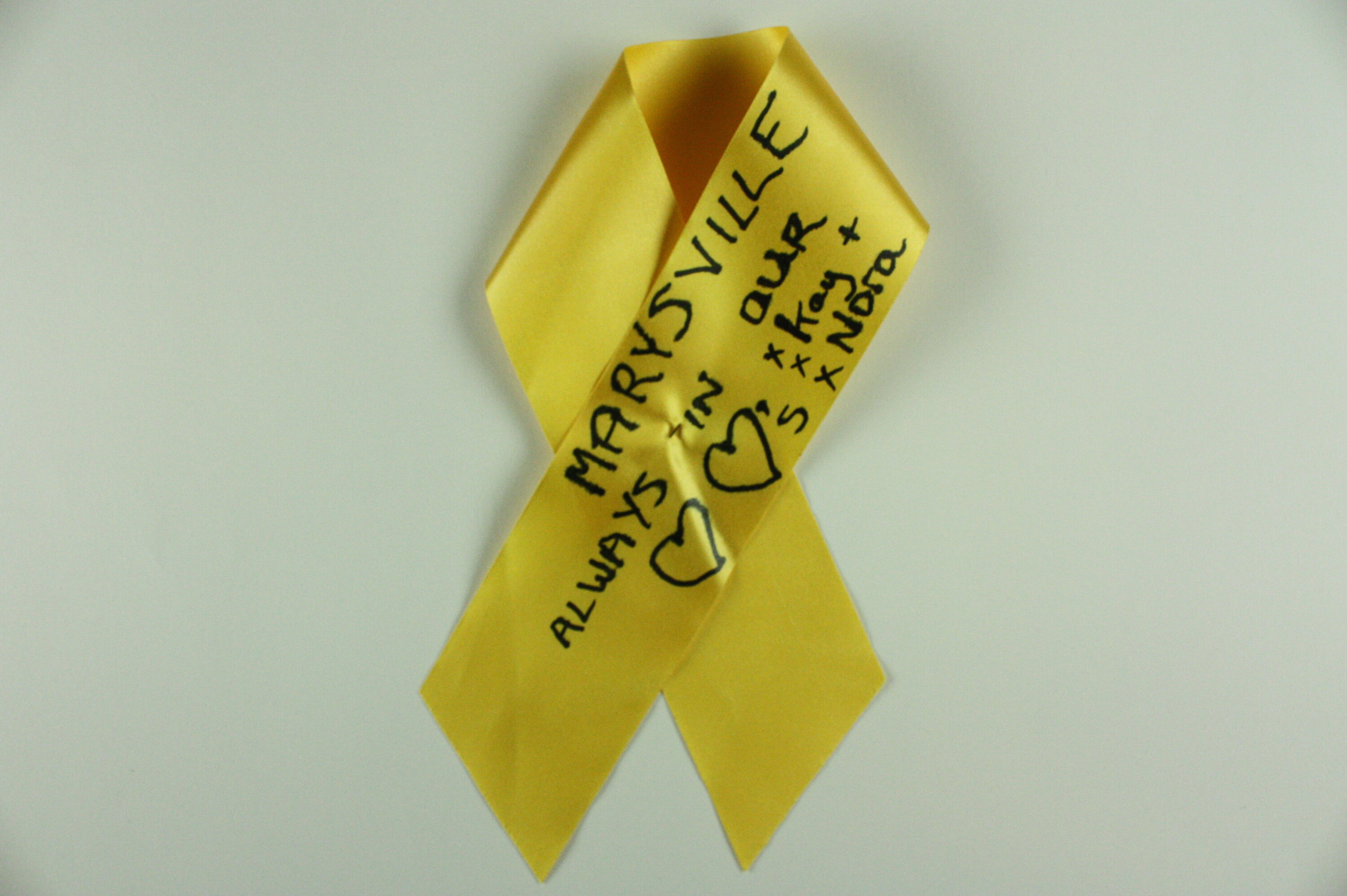 One of nine hand written yellow ribbons placed on 'The Tree of Remembrance' during its display at the Rebuilding Advisory Centres at Marysville and Kinglake, during February and March 2011. Blank yellow ribbons were available for visitors to Marysville and Kinglake to write and attach messages to the tree.