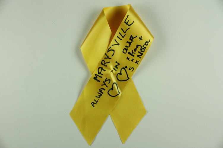 The 2nd Anniversary Memorial Service commemorating the 2009 Victorian Bushfires encouraged people to actively participate in the service by writing a message on a 'ribbon of remembrance'. These items give form to the grief and the many ways in which symbols and rituals were used to mark this anniversary. The 2nd anniversary memorial service also shows the significant ways in which the impact of the disaster has rippled out into wider circles beyond those who were directly impacted. Where the 1st anniversary service was concerned with commemorating the loss of 173 people, the 2nd anniversary service paid particular attention to the impact of the disaster on locations, towns and broader communities, including the bereaved.