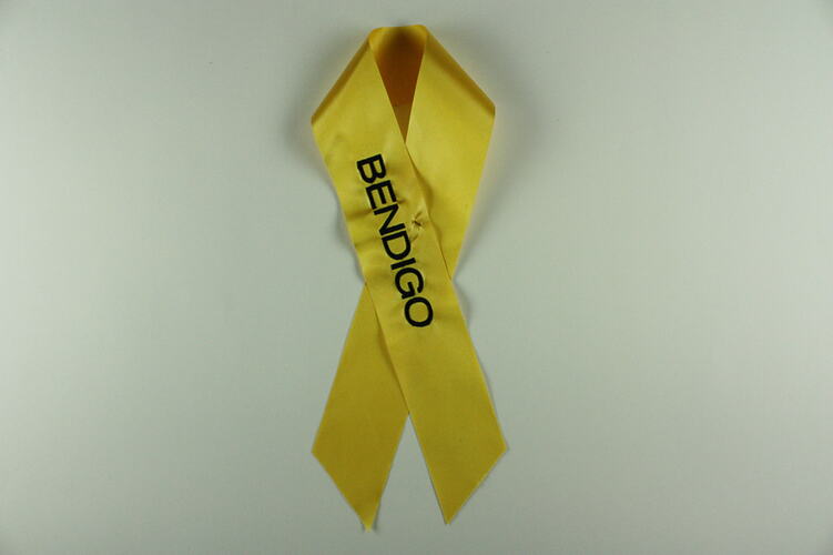 These 34 pre-printed 'Ribbons of Remembrance' ribbons, were created to acknowledge the various communities from across Victoria including the bereaved, and placed on branches of the 'Tree of Remembrance' by community representatives. The communities identified were: Bendigo, Kinglake Ranges, Drouin West, Cardinia, Flowerdale, Indigo, Yarra Ranges, Boolarra & Yinnar, St Andrews & Christmas Hills, Casey, Mitchell Shire, Strath Creek, Labertouche, Hepburn, Longwarry, Whittlesea, Gormandale, Redesdale, Horsham, Marysville & Triangle, Bowman Murmungee, Toolangi & Castella, Balook, Alpine, Corangamite, Melba Group, Jindivick, Southern Grampians, Yarram, Hazelwood-Jeeralang, Strathewen, Traralgon South & District, Mirboo North, Bereaved Community.
