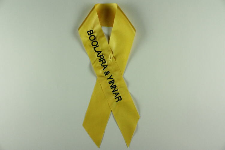 One of 34 pre-printed yellow ribbons placed on 'The Tree of Remembrance' at the 2nd Anniversary Memorial Service to commemorate the 2009 Victorian bushfires. Placed on tree by Peter Ryan, Minister for Bushfire Response.