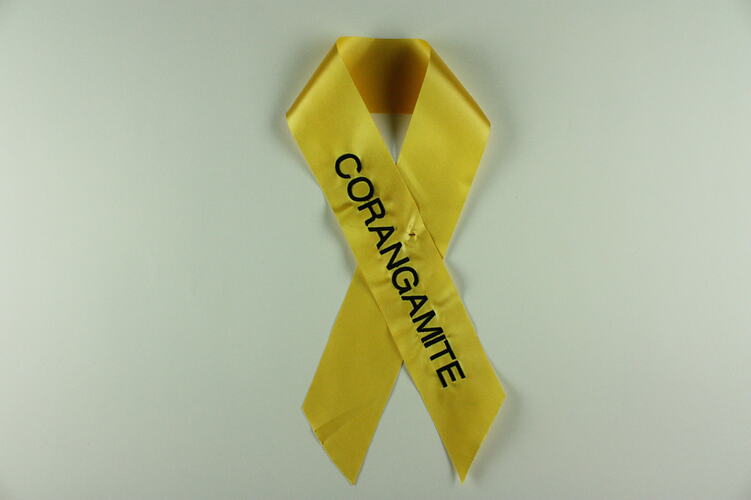 One of 34 pre-printed yellow ribbons placed on 'The Tree of Remembrance' at the 2nd Anniversary Memorial Service to commemorate the 2009 Victorian bushfires. Placed on tree by Bill Shorten, Assistant Treasurer and Minister for Financial Services and Superannuation.
