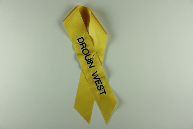 One of 34 pre-printed yellow ribbons placed on 'The Tree of Remembrance' at the 2nd Anniversary Memorial Service to commemorate the 2009 Victorian bushfires. Placed on tree by Julie Bishop, Deputy Leader of the Opposition.