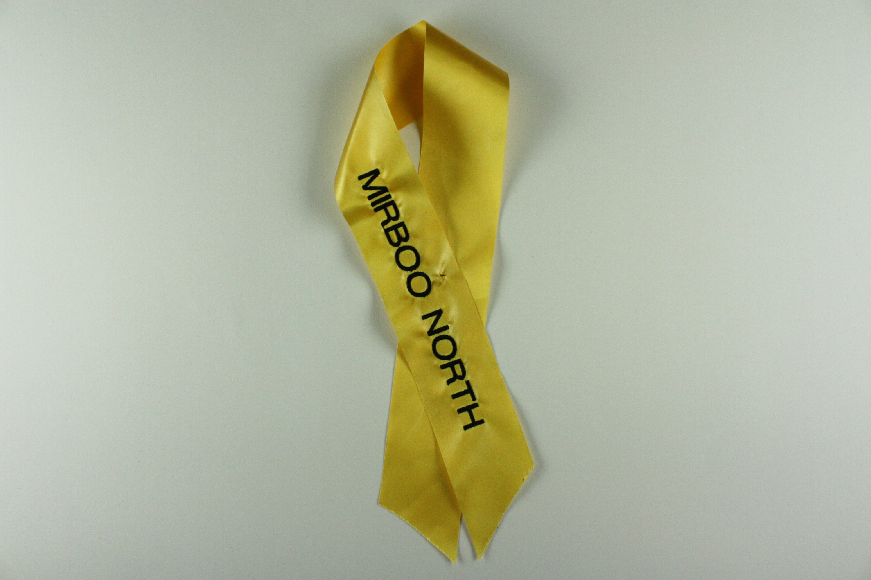 Length of yellow ribbon with black embroidered text.