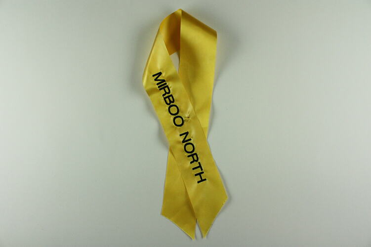 These 34 pre-printed 'Ribbons of Remembrance' ribbons, were created to acknowledge the various communities from across Victoria including the bereaved, and placed on branches of the 'Tree of Remembrance' by community representatives. The communities identified were: Bendigo, Kinglake Ranges, Drouin West, Cardinia, Flowerdale, Indigo, Yarra Ranges, Boolarra & Yinnar, St Andrews & Christmas Hills, Casey, Mitchell Shire, Strath Creek, Labertouche, Hepburn, Longwarry, Whittlesea, Gormandale, Redesdale, Horsham, Marysville & Triangle, Bowman Murmungee, Toolangi & Castella, Balook, Alpine, Corangamite, Melba Group, Jindivick, Southern Grampians, Yarram, Hazelwood-Jeeralang, Strathewen, Traralgon South & District, Mirboo North, Bereaved Community.
