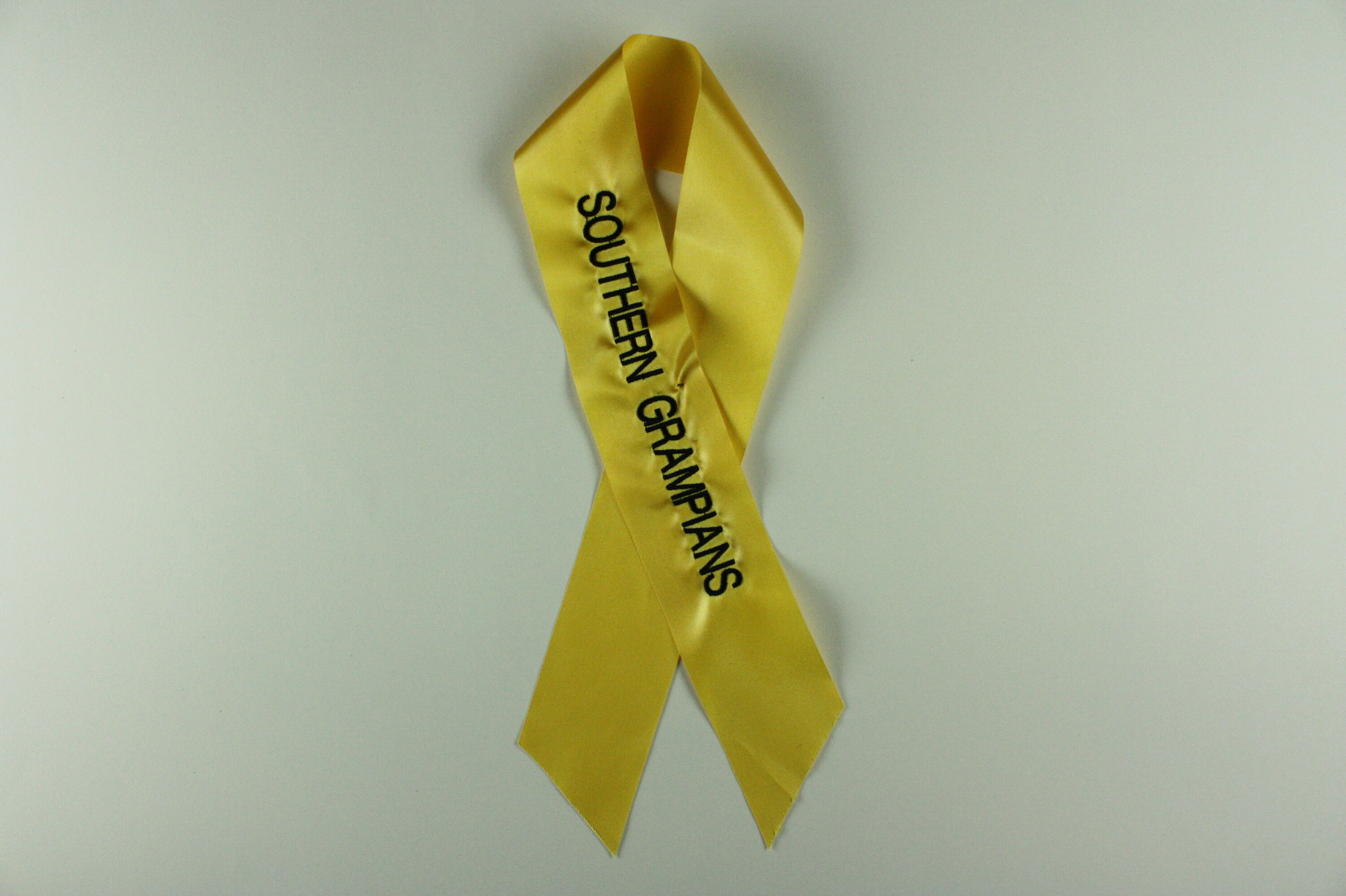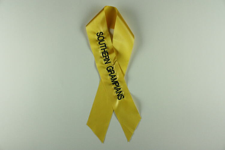These 34 pre-printed 'Ribbons of Remembrance' ribbons, were created to acknowledge the various communities from across Victoria including the bereaved, and placed on branches of the 'Tree of Remembrance' by community representatives. The communities identified were: Bendigo, Kinglake Ranges, Drouin West, Cardinia, Flowerdale, Indigo, Yarra Ranges, Boolarra & Yinnar, St Andrews & Christmas Hills, Casey, Mitchell Shire, Strath Creek, Labertouche, Hepburn, Longwarry, Whittlesea, Gormandale, Redesdale, Horsham, Marysville & Triangle, Bowman Murmungee, Toolangi & Castella, Balook, Alpine, Corangamite, Melba Group, Jindivick, Southern Grampians, Yarram, Hazelwood-Jeeralang, Strathewen, Traralgon South & District, Mirboo North, Bereaved Community.