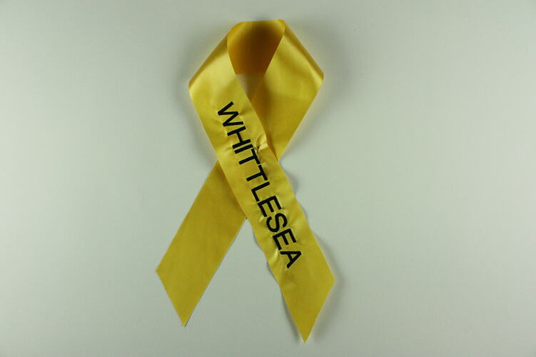 These 34 pre-printed 'Ribbons of Remembrance' ribbons, were created to acknowledge the various communities from across Victoria including the bereaved, and placed on branches of the 'Tree of Remembrance' by community representatives. The communities identified were: Bendigo, Kinglake Ranges, Drouin West, Cardinia, Flowerdale, Indigo, Yarra Ranges, Boolarra & Yinnar, St Andrews & Christmas Hills, Casey, Mitchell Shire, Strath Creek, Labertouche, Hepburn, Longwarry, Whittlesea, Gormandale, Redesdale, Horsham, Marysville & Triangle, Bowman Murmungee, Toolangi & Castella, Balook, Alpine, Corangamite, Melba Group, Jindivick, Southern Grampians, Yarram, Hazelwood-Jeeralang, Strathewen, Traralgon South & District, Mirboo North, Bereaved Community.