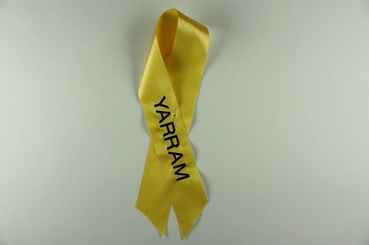 These 34 pre-printed 'Ribbons of Remembrance' ribbons, were created to acknowledge the various communities from across Victoria including the bereaved, and placed on branches of the 'Tree of Remembrance' by community representatives. The communities identified were: Bendigo, Kinglake Ranges, Drouin West, Cardinia, Flowerdale, Indigo, Yarra Ranges, Boolarra & Yinnar, St Andrews & Christmas Hills, Casey, Mitchell Shire, Strath Creek, Labertouche, Hepburn, Longwarry, Whittlesea, Gormandale, Redesdale, Horsham, Marysville & Triangle, Bowman Murmungee, Toolangi & Castella, Balook, Alpine, Corangamite, Melba Group, Jindivick, Southern Grampians, Yarram, Hazelwood-Jeeralang, Strathewen, Traralgon South & District, Mirboo North, Bereaved Community.