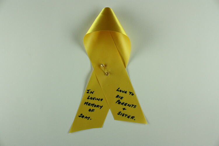 One of 65 hand written yellow ribbons placed on 'The Tree of Remembrance' at the 2nd Anniversary Memorial Service to commemorate the 2009 Victorian bushfires and to honour the family and friends who died as a result of the 2009 bushfires.