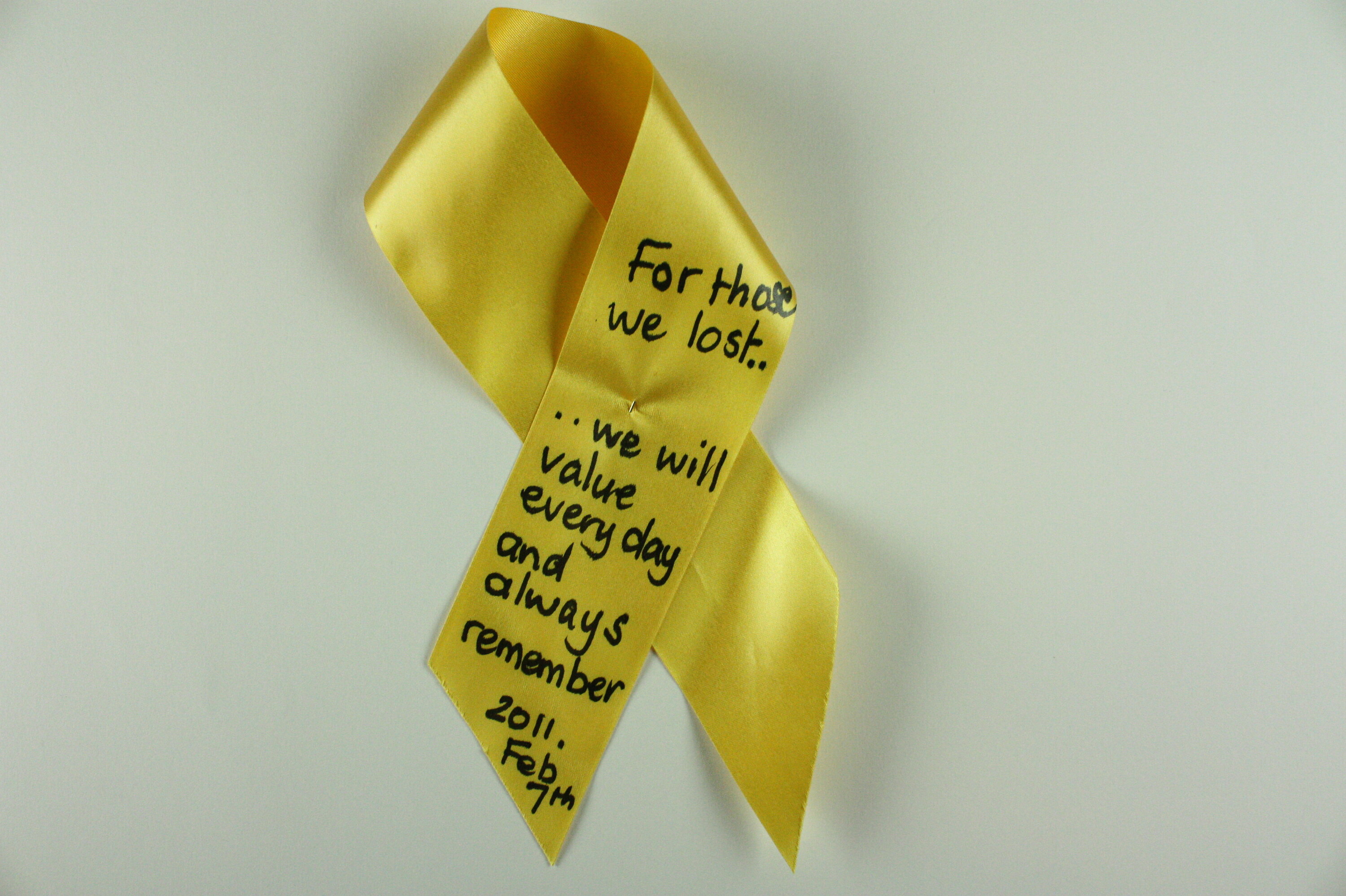 One of 65 hand written yellow ribbons placed on 'The Tree of Remembrance' at the 2nd Anniversary Memorial Service to commemorate the 2009 Victorian bushfires and to honour the family and friends who died as a result of the 2009 bushfires.