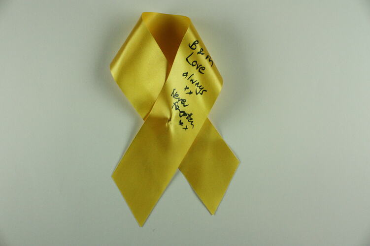 One of 65 hand written yellow ribbons placed on 'The Tree of Remembrance' at the 2nd Anniversary Memorial Service to commemorate the 2009 Victorian bushfires and to honour the family and friends who died as a result of the 2009 bushfires.