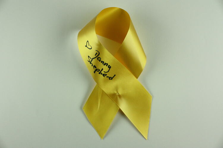The 2nd Anniversary Memorial Service commemorating the 2009 Victorian Bushfires encouraged people to actively participate in the service by writing a message on a 'ribbon of remembrance'. These items give form to the grief and the many ways in which symbols and rituals were used to mark this anniversary. The 2nd anniversary memorial service also shows the significant ways in which the impact of the disaster has rippled out into wider circles beyond those who were directly impacted. Where the 1st anniversary service was concerned with commemorating the loss of 173 people, the 2nd anniversary service paid particular attention to the impact of the disaster on locations, towns and broader communities, including the bereaved.