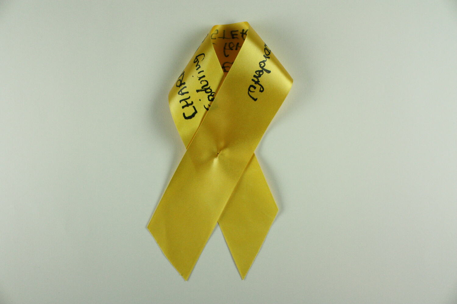 Length of yellow ribbon with black handwritten text.