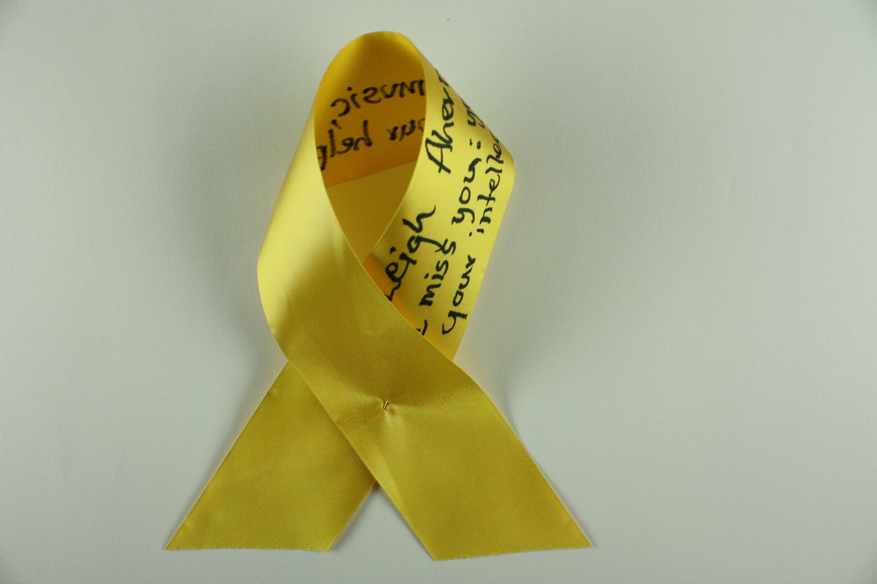 Length of yellow ribbon with black handwritten text.