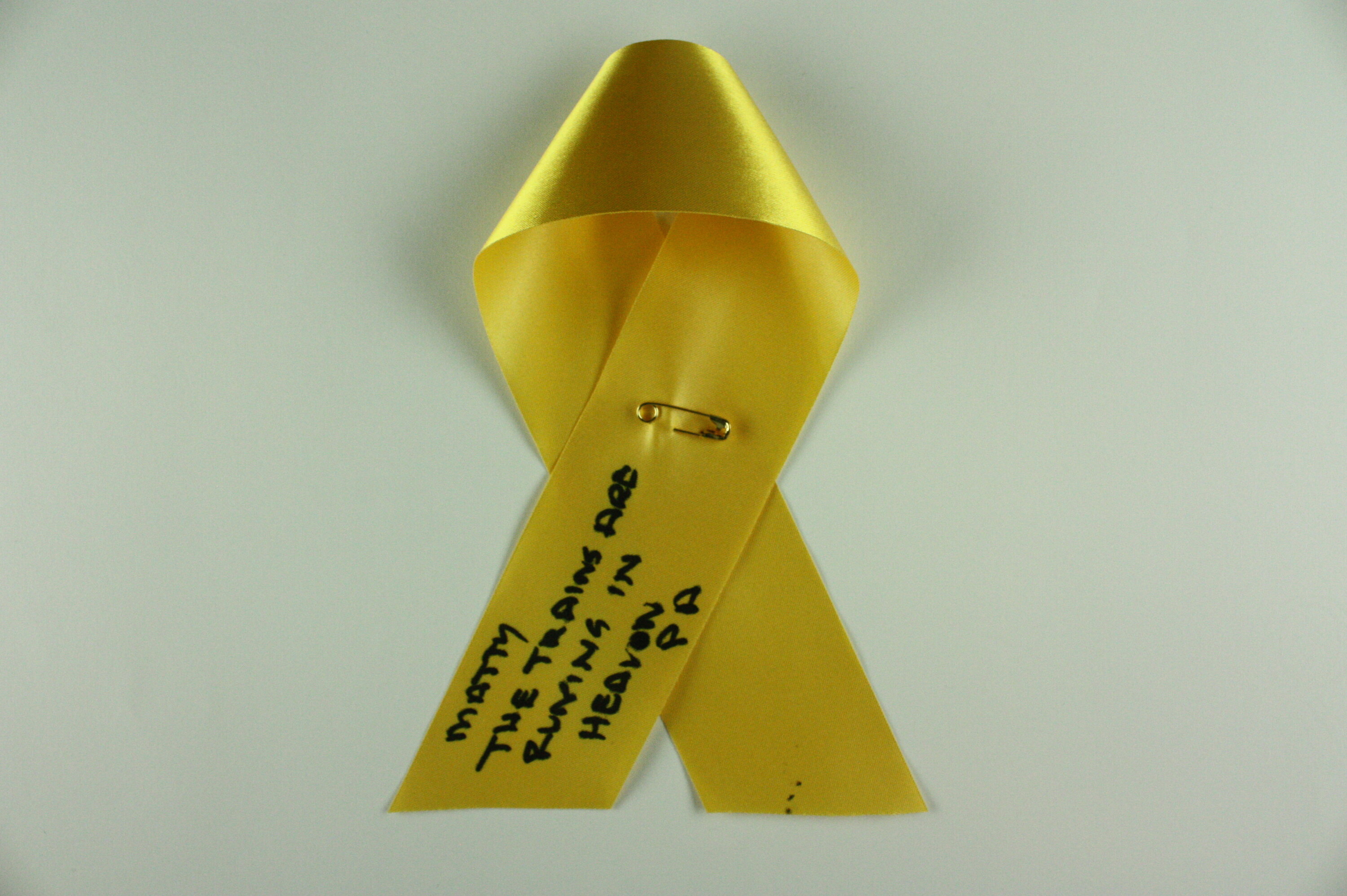 Length of yellow ribbon with black handwritten text.