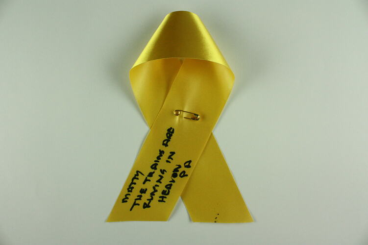 One of 65 hand written yellow ribbons placed on 'The Tree of Remembrance' at the 2nd Anniversary Memorial Service to commemorate the 2009 Victorian bushfires and to honour the family and friends who died as a result of the 2009 bushfires.