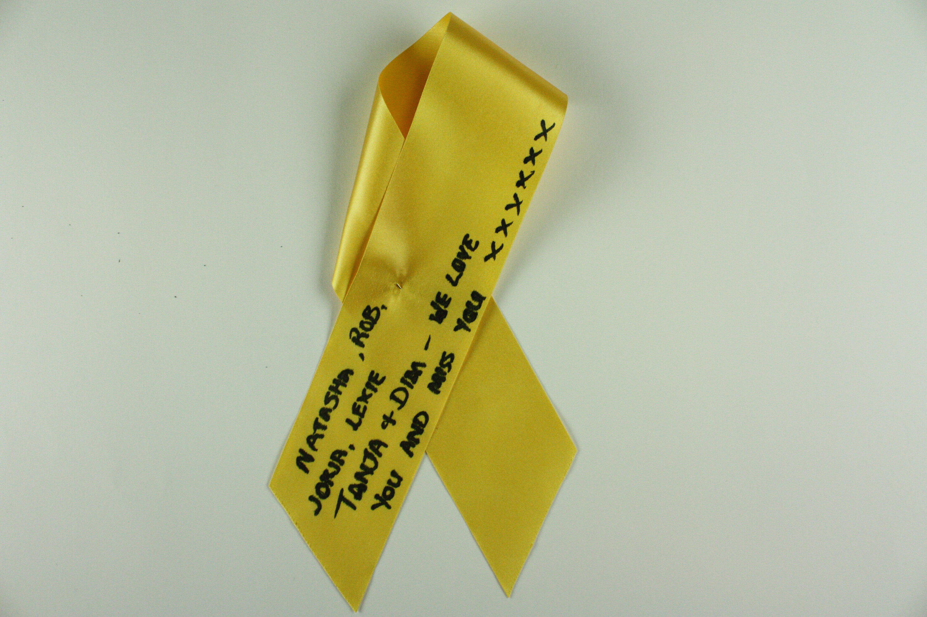Length of yellow ribbon with black handwritten text.
