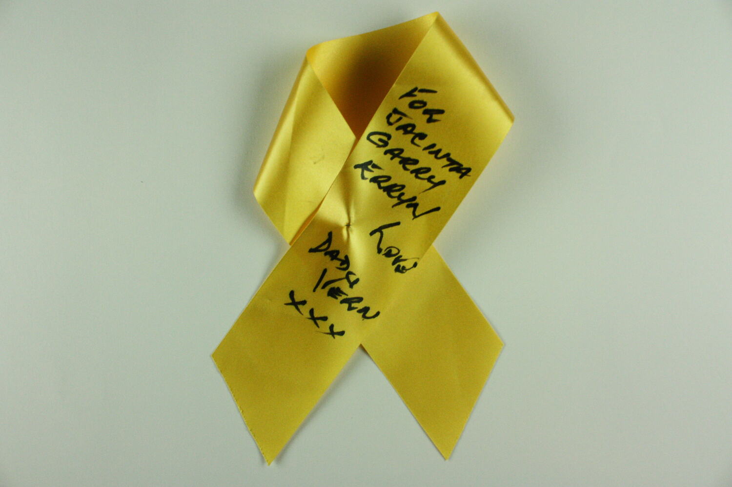 Length of yellow ribbon with black handwritten text.