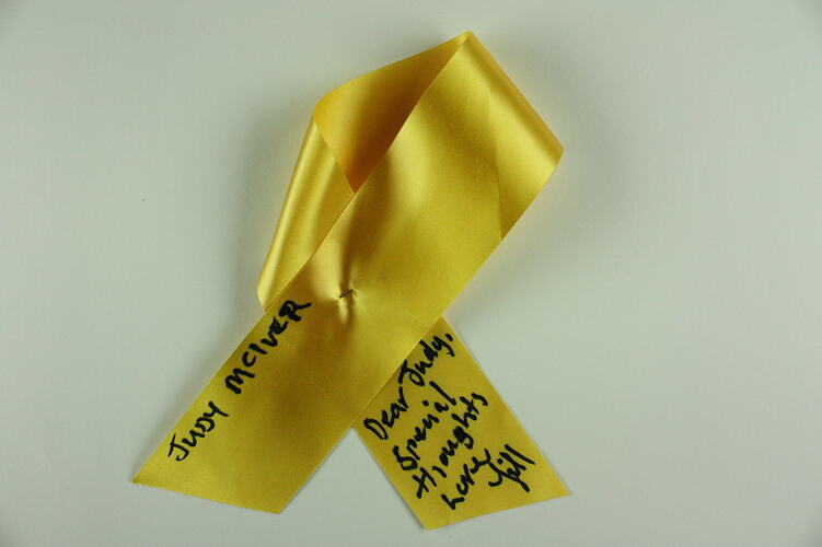 One of 65 hand written yellow ribbons placed on 'The Tree of Remembrance' at the 2nd Anniversary Memorial Service to commemorate the 2009 Victorian bushfires and to honour the family and friends who died as a result of the 2009 bushfires.