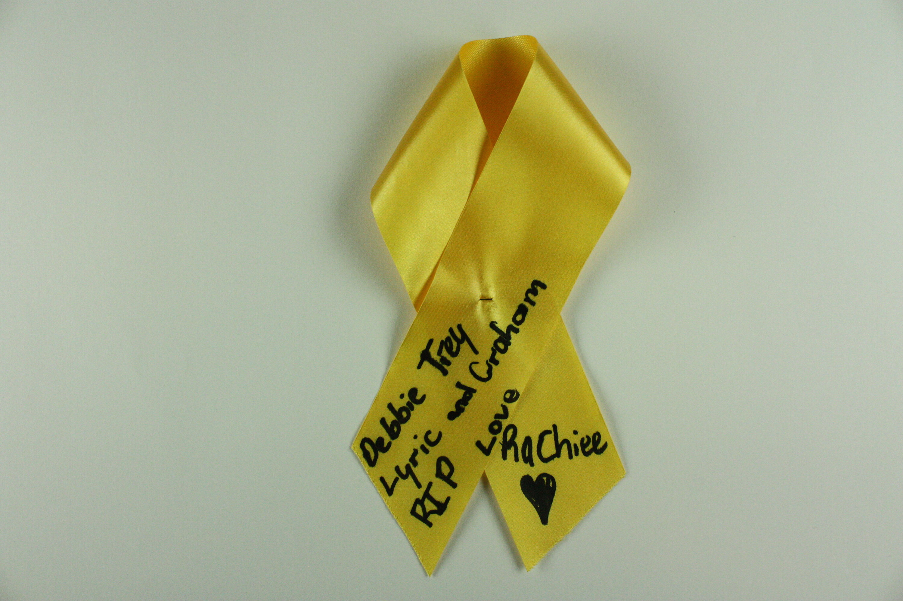 Length of yellow ribbon with black handwritten text.
