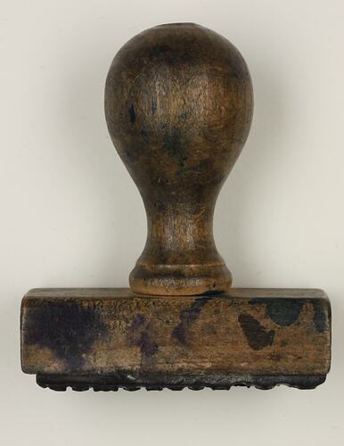 Ink stamp with wooden rounded handle and base to which is attached the rubber stamp with raised lettering.