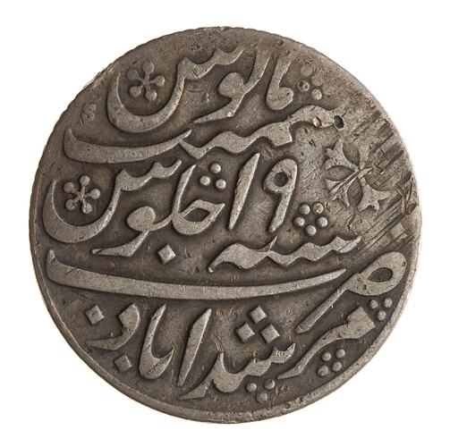 Julus formula with mark S near left rim (translation: Struck at Murshidabad in the 19 year of his tranquil prosperity)