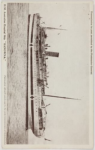 Printed on the front of the postcard; 'Transmission by post permitted by the Postmaster General. / H.M. Australian Hospital Ship 'KANOWNA.' (Publication officially sanctioned by the Lords Commissioners of the Admiralty).' Printed on the back of the postcard; 'POST CARD / Adress to be written here' Hand written in blue ink on the back of the postcard; '2nd Aus Hospital Ship / Kanowna / 1916'