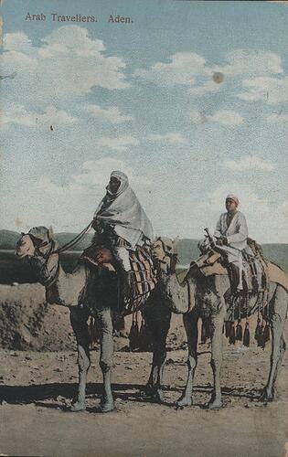 Printed in red ink on the top left corner on the front of the postcard: 'Arab Travellers. Aden' Printed in blue ink on the back of the postcard in the centre (horizontal orientation): 'POST-CARD / 'Cartolina - Carte Postale / Corespondence ; Address' Printed in blue ink on the back of the postcard on the bottom left corner (horizontal orientation): '130'