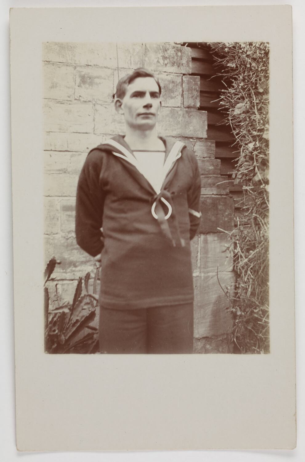 Portrait of a seaman standing in front of a brick wall during World War I.