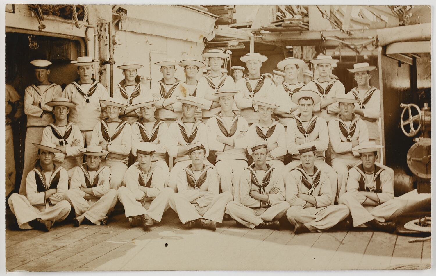 The images depict photographs of sailors from HMAS Australia and of family and friends. It also conatins a mixture of hand-painted cards (two), original photographs (mostly studio or professional) and several commerical postcards.
